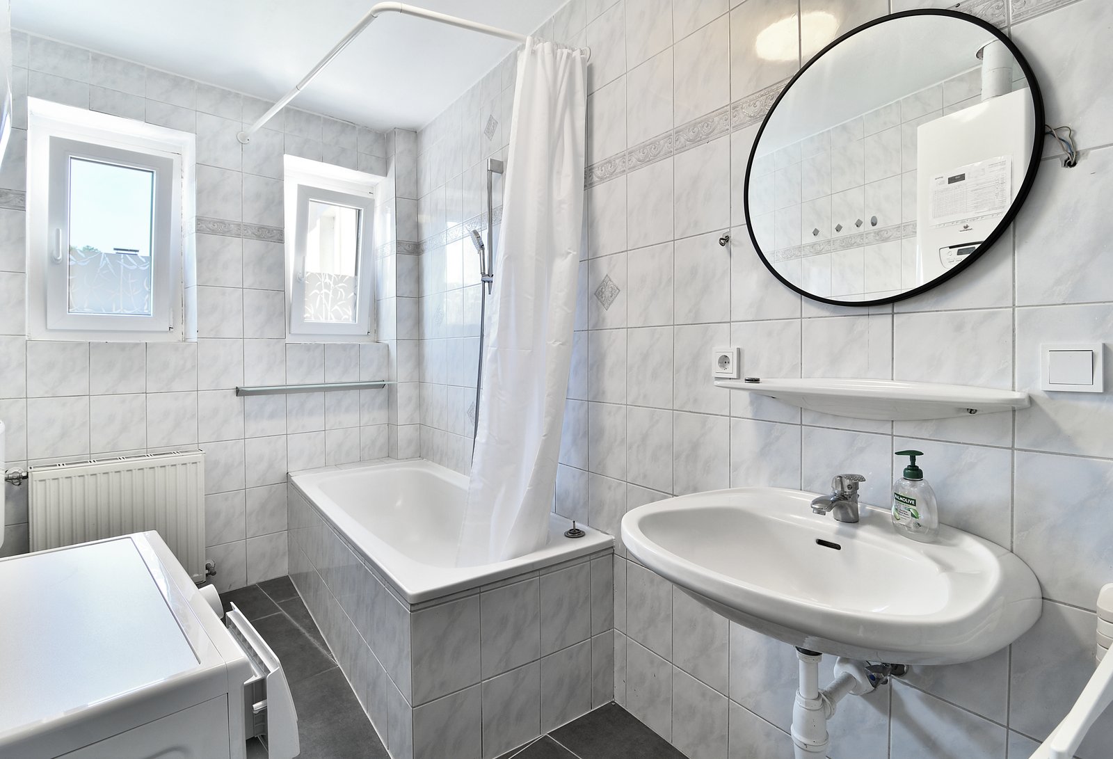 • Badezimmer mit Badewanne, WC und Waschmaschine