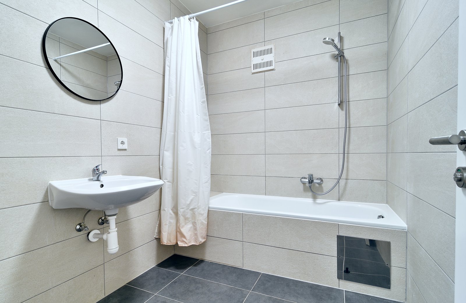 - Badezimmer mit Badewanne und getrenntem WC mit Waschmaschine