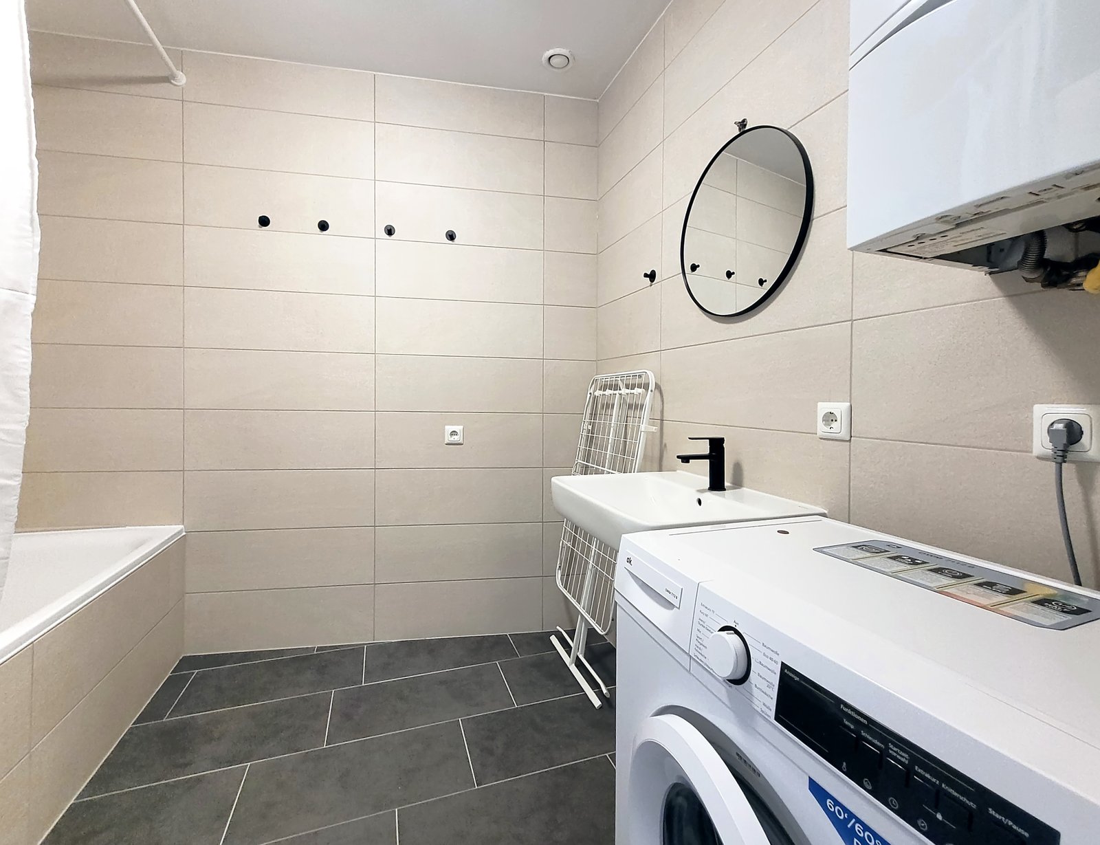 - Badezimmer mit Badewanne, WC und Waschmaschine